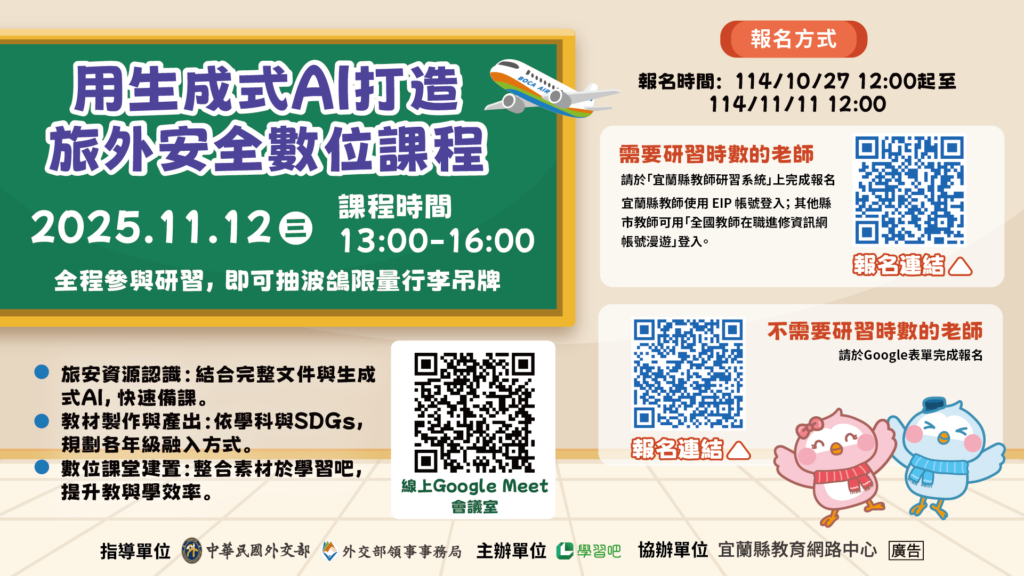 ✈️上次錯過的老師別再錯過!第二期「用生成式AI打造旅外安全數位課程」研習開放報名囉!